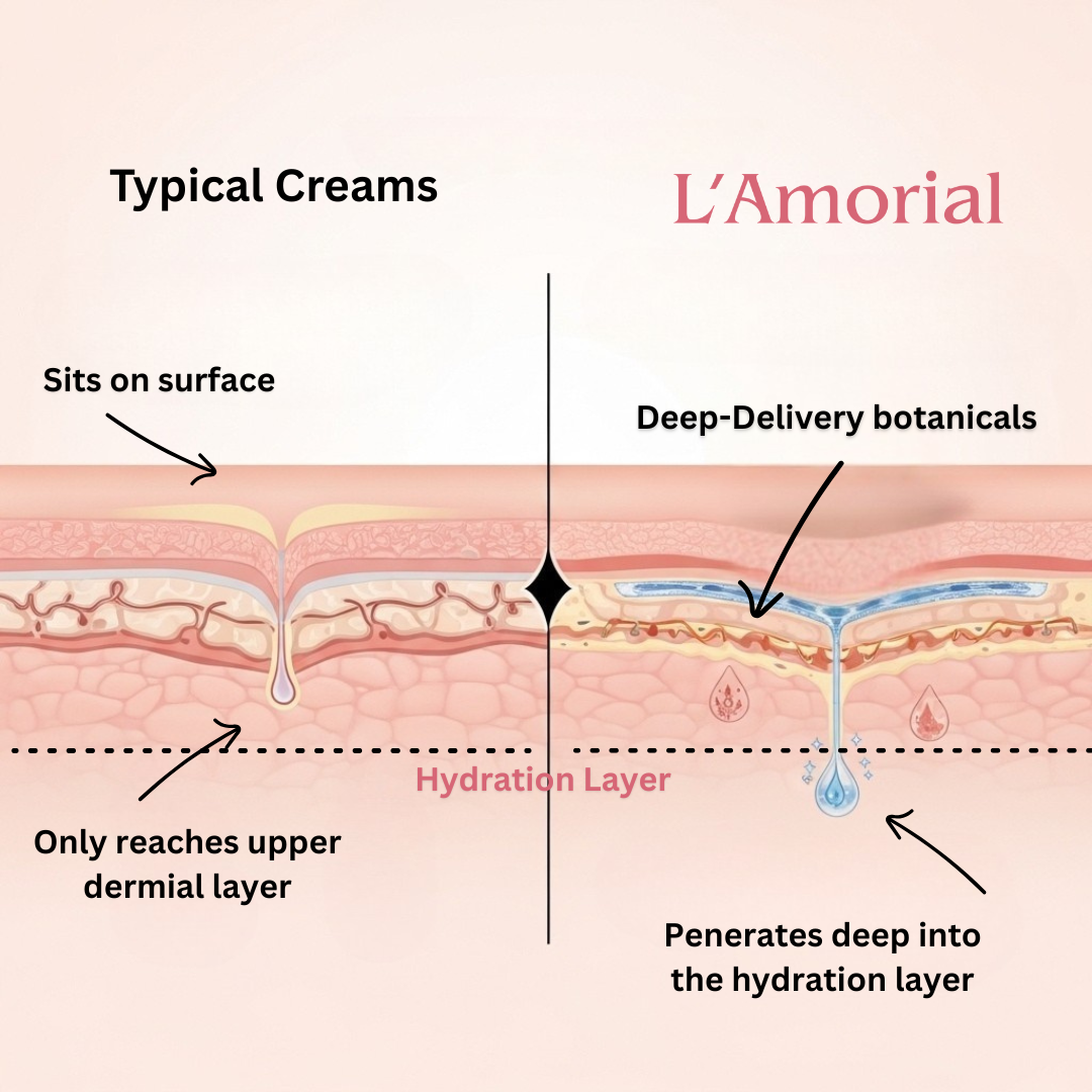 L’Amorial™ uses a deeper-delivery botanical complex designed to support comfort beneath the surface, where tension, heat, and nighttime discomfort begin.